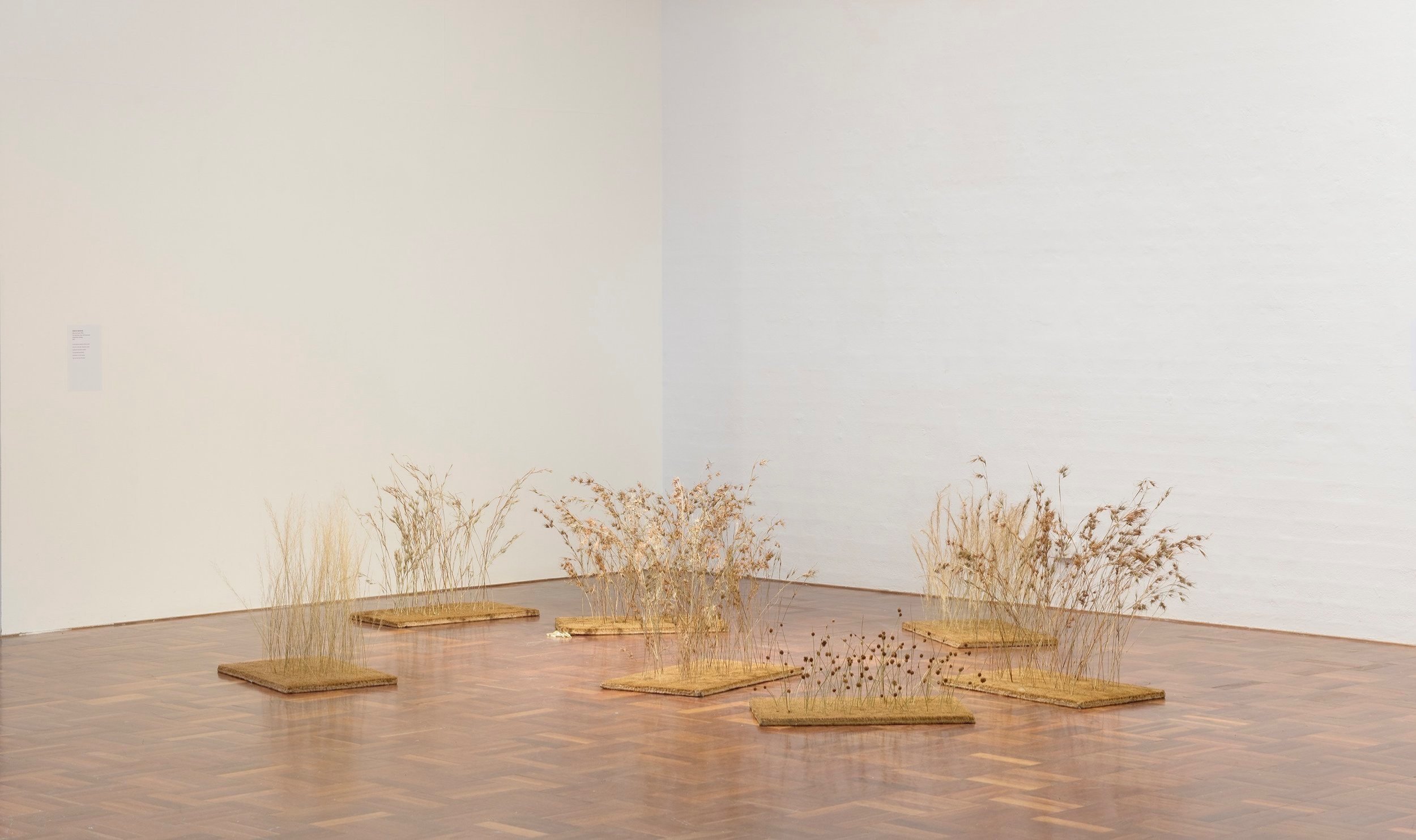 Woven water grass doormats, native Australian plants from artist’s garden, encaustic wax, found copper wire